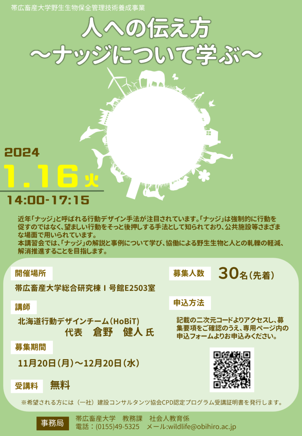 帯広畜産大学の野生生物保全管理技術養成事業の講習会として、令和6年1月16日(火)に「人への伝え方~ナッジについて学ぶ~」を開催します。