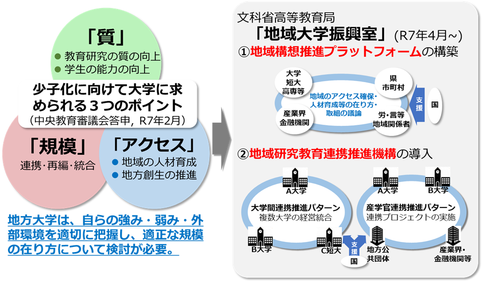 「質」とは教育の質の向上や学生の能力の向上、「規模」とは少子化を見据えた大学間の連携や再編・統合、そして「アクセス」とは、大学から物理的あるいは時間的に遠い人たちにも高等教育の機会を提供し、地方創生に貢献する人材を育てることを意味しています。