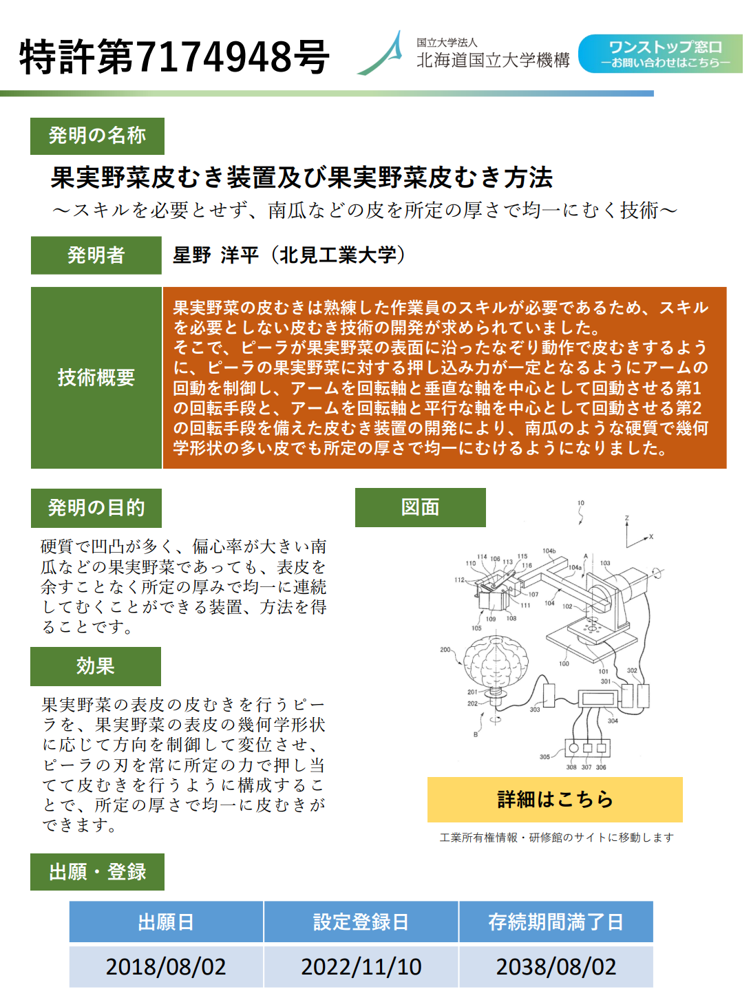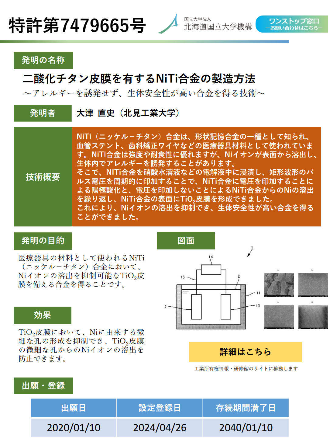 北海道国立大学機構が持っている知的財産権を順次ご紹介しています。今回は、「二酸化チタン皮膜を有するNiTi合金の製造方法」と、「果実野菜皮むき装置及び果実野菜皮むき方法」の2件です。共同研究やライセンス契約検討の参考にしてください。