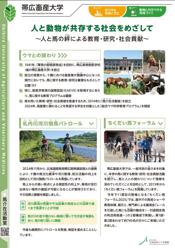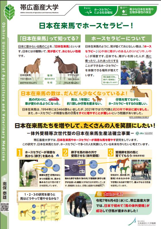 当機構の出展は昨年に引き続き2回目で、今回は「美幌実証実験住宅」や「メタンを抑制する飼料開発」などの気候変動の原因である温室効果ガスを削減・再利用するための研究や、「日本在来馬生産法確立事業」、「日本在来馬によるホースセラピー」などの生物多様性や動物との共生に関する取組をご紹介しました。