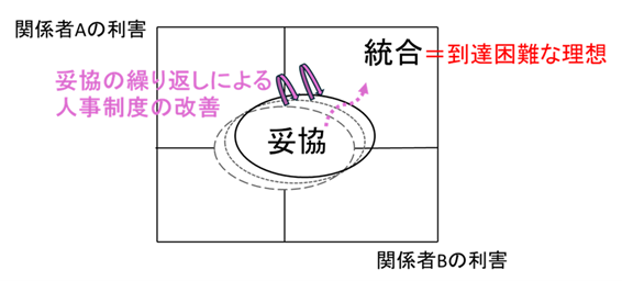 関係者の利害を互いに最大限満たす「統合」状態には至らなくても、「妥協」の繰り返しで継続的・遷移的に制度を改善していく
