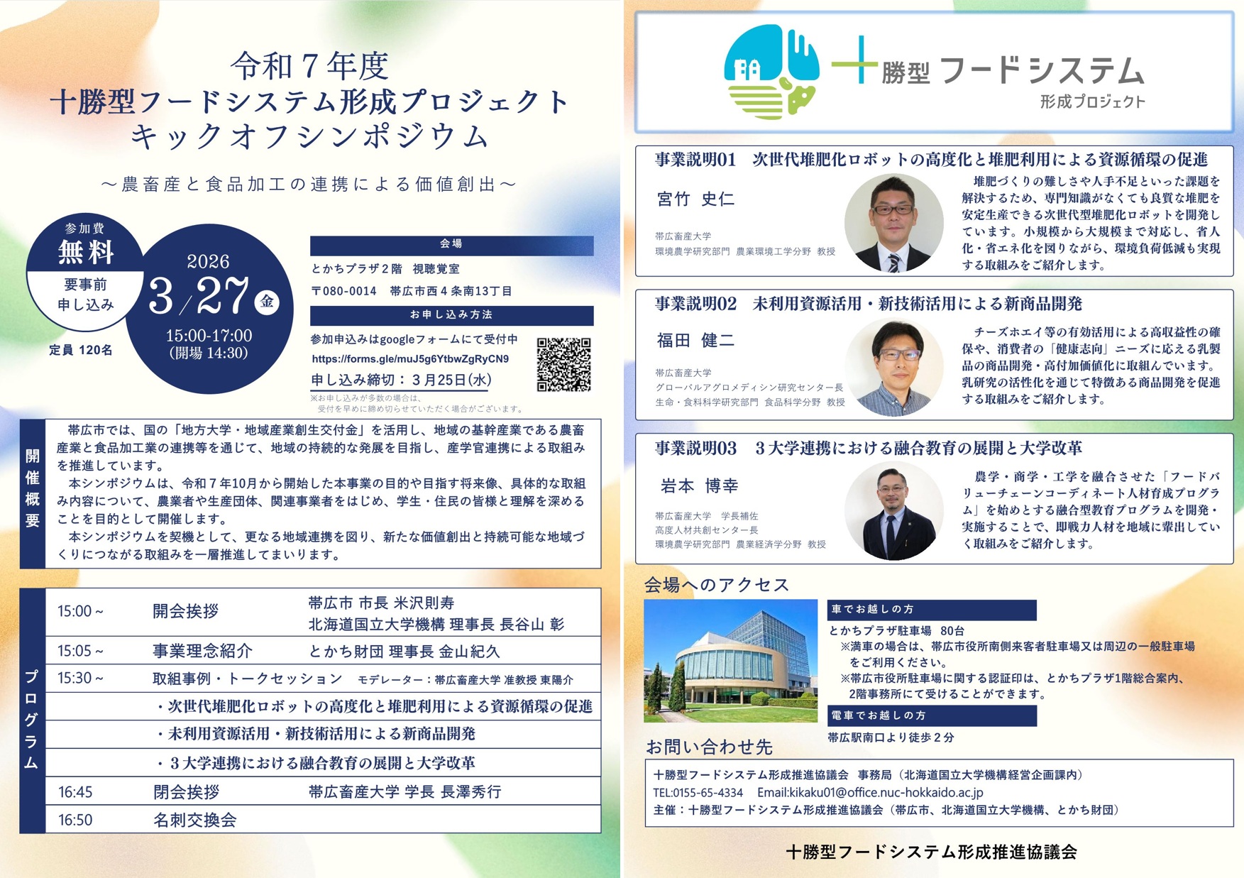 本シンポジウムでは、令和7年10月より開始した事業の紹介に加え、帯広畜産大学の教員による取組事例の紹介やトークセッションも予定しています。