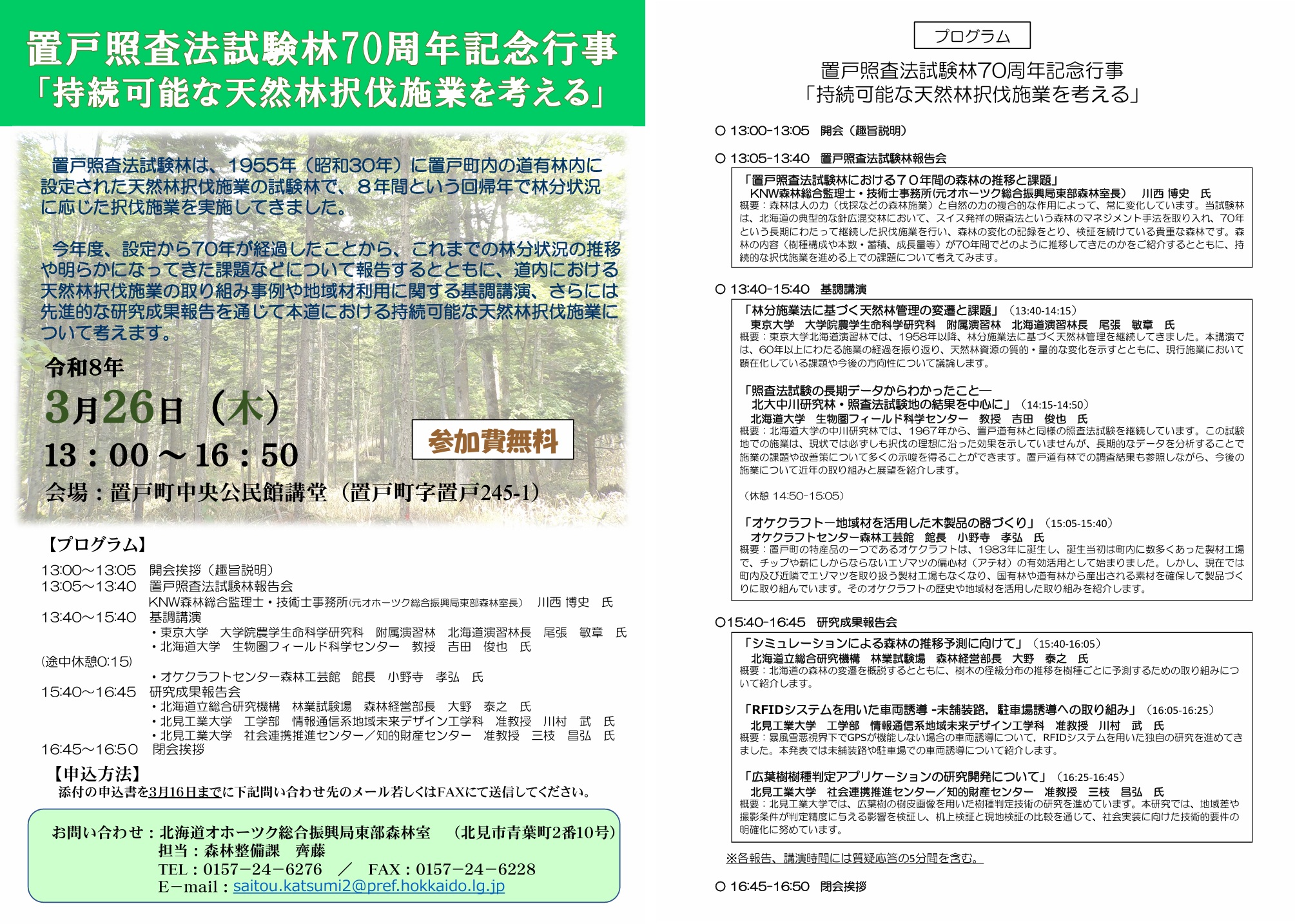 令和8年3月26日(木)、置戸町中央公民館講堂にて、置戸照査法試験林70周年記念行事「持続可能な天然林択伐施業を考える」が開催されます。