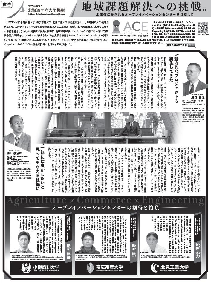 2026/03/16 【オープンイノベーションセンター(ACE)】ACE紹介記事を北海道新聞に掲載しました この度、2月28日(土)の北海道新聞にACEの取組みを紹介する記事広告を掲載しました。 認知度を高め、取組み・活動を周知し、新しい案件創造につなげることを目的としており、三大学の教員からの期待と抱負も紹介しています。 今後も、活動を知っていただくための発信を強化し、ご興味のある方に様々な形でACEの研究プロジェクトに参画していただけるよう、取り組んでまいります。