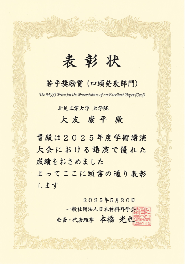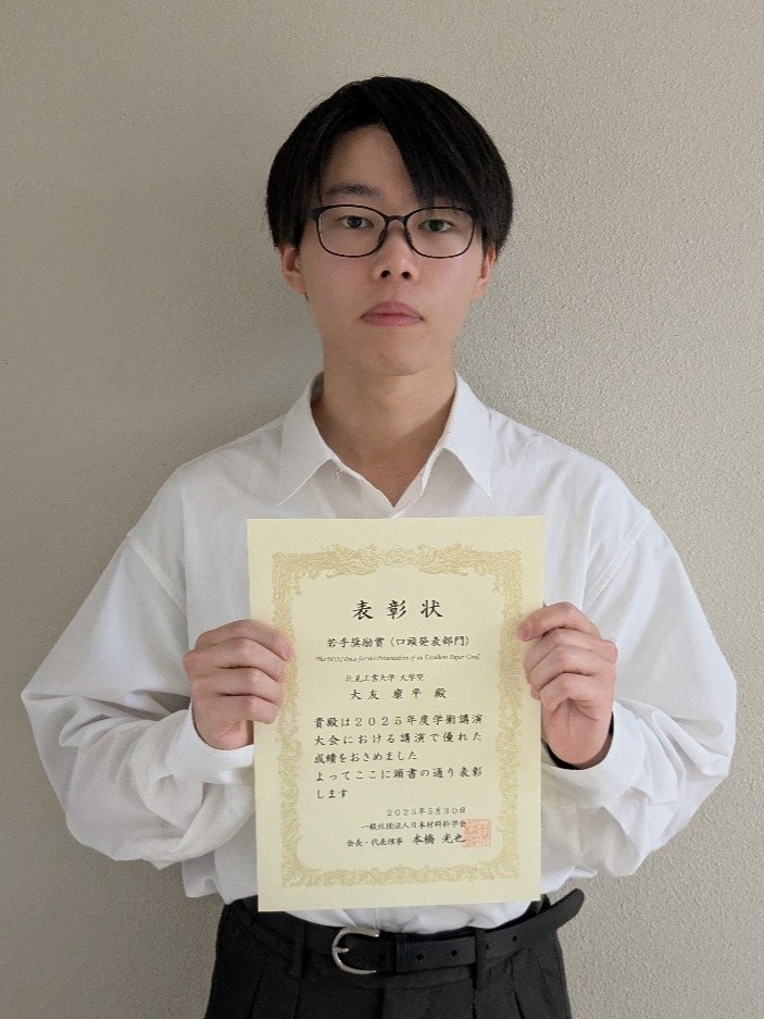 5月29日(木)~30日(金)に早稲田大学で開催された「2025年度 一般社団法人日本材料科学会 学術講演大会」(主催:一般社団法人 日本材料科学会)において、本学大学院生の大友康平さん(博士前期課程 機械電気工学プログラム2年、指導教員:平井慈人准教授)が、若手奨励賞(口頭発表部門)を受賞しました。