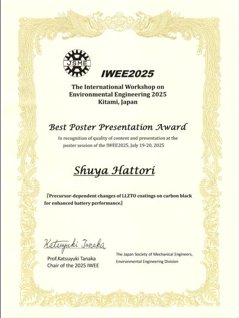 7月18日(金)~21日(月)、北見工業大学で開催された「International Workshop on Environmental Engineering 2025 (IWEE2025)」において、本学大学院生の服部修弥さん(博士前期課程 工学専攻 機械電気工学プログラム1年、指導教員:大野智也教授)が、Best Poster Presentation Awardを受賞しました。