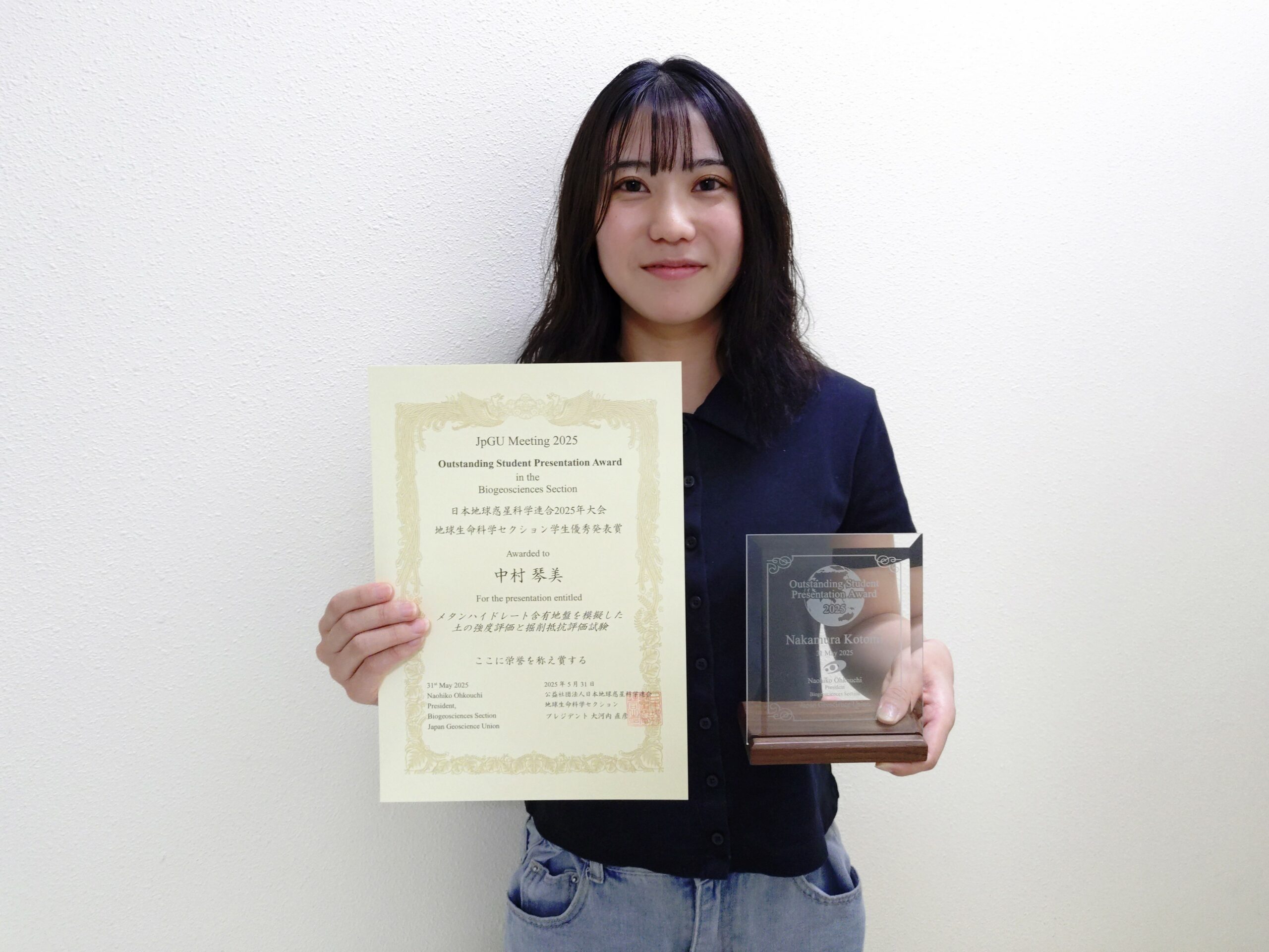 5月25日(日)~30日(金)に幕張メッセ(千葉市)で開催された、「日本地球惑星科学連合2025年大会」(主催:公益社団法人日本地球惑星科学連合)において、本学大学院生の中村琴美さん(博士前期課程 社会環境工学プログラム2年、指導教員:山下聡教授)が、地球生命科学セクション学生優秀発表賞を受賞しました。