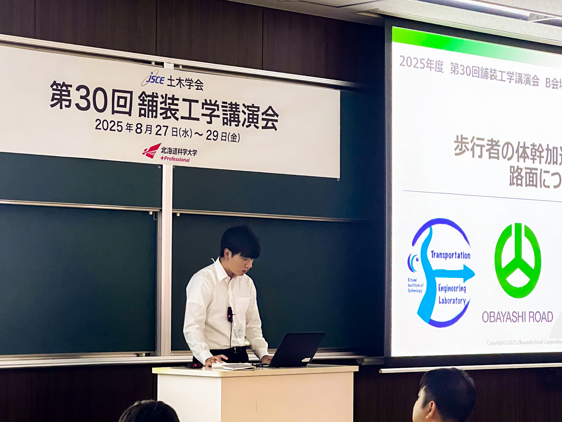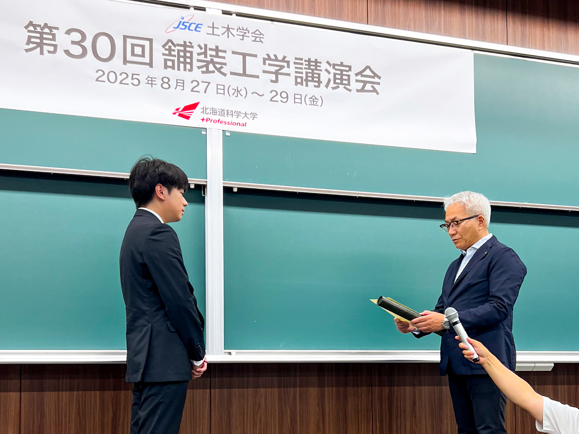8月27日(水)~29日(金)、北海道科学大学(札幌市)で開催された「第30回舗装工学講演会」(主催:公益社団法人 土木学会)において、交通工学研究室に所属する吉田昴さん(博士前期課程 工学専攻 社会環境工学プログラム1年、主指導教員:富山和也教授)が、優秀講演者賞を受賞しました。