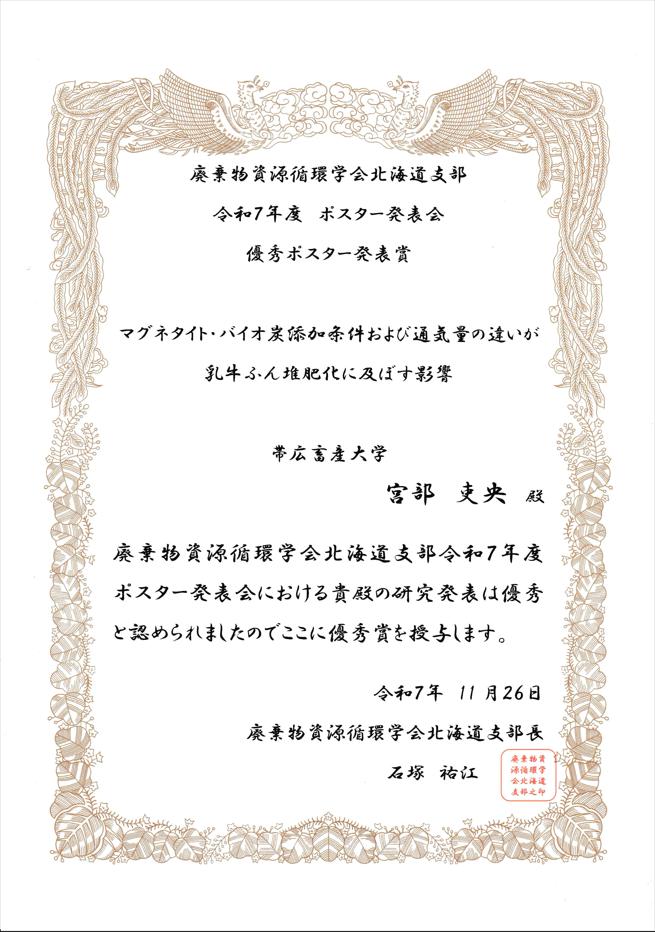 【帯広畜産大学】宮部吏央さんが2025年度廃棄物資源循環学会北海道支部研究発表会において優秀ポスター発表賞を受賞